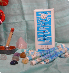 With "stick" moxa, a cigar shaped roll of moxa "mugwort" (artemisia vulgaris, often mixed with other herbs) is held close to the skin, imparting heat and other medicinal qualities in a broader pattern, to heal or alleviate arias of pain and discomfort.